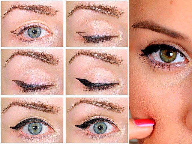 Avant de commencer la technique du dessin des flèches, vous devez déterminer la forme des yeux. En effet, pour chaque forme d’œil, une certaine technique de flèche convient. Les flèches classiques conviendront à presque toutes les filles, mais il est difficile de les représenter avec précision. Si vous dessinez une flèche pour la première fois, une règle doit être prise en compte: la main qui tiendra la flèche doit être stable. Mais, dans le cas d'une ligne asymétrique, il est toujours possible d'utiliser des ombres, grâce à quoi vous pouvez facilement masquer la flèche non réussie et transformer le maquillage avec une nouvelle tournure.