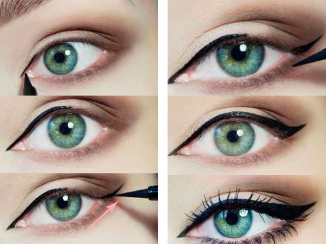 La peinture des eye-liner n’est fondamentalement pas différente d’un crayon. Auparavant, la paupière devait être nettoyée avec un démaquillant. Après avoir appliqué vos ombres de couleur préférées. Ensuite, passez à l'application d'eye-liner. La ligne doit être tracée à partir du coin interne de l'œil, en l'élargissant jusqu'au milieu de la paupière et en diminuant à nouveau jusqu'au coin externe de la paupière. Les flèches de la queue doivent rester nettes. De nombreuses leçons pas à pas sur la manière de dessiner des flèches à l'aide d'un eye-liner sont visibles sur la photo et la vidéo.