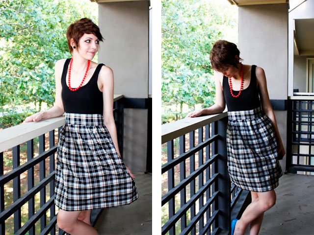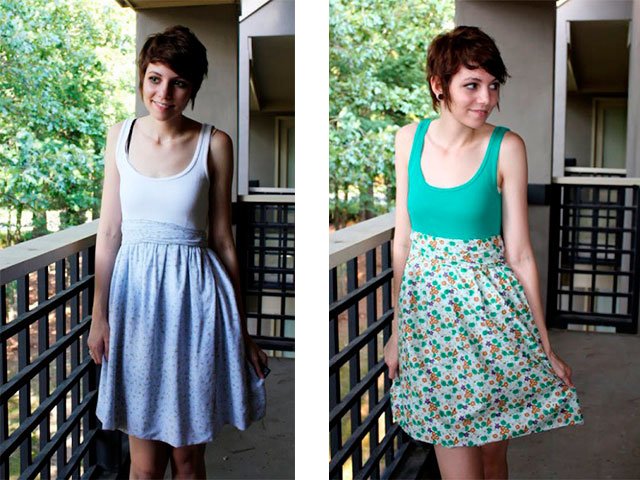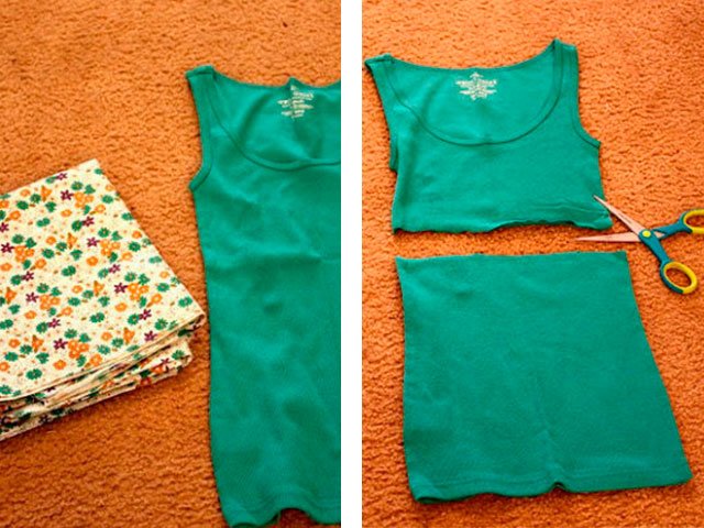 Prendre vieux t-shirt et jupeou pièce un mur au dessus d'une maison. Ils devraient s'emboîtent. Top vaut mieux choisir tricoté, et la jupe devrait être plus légère. Vous ferez un tel modèle en moins d’une heure.