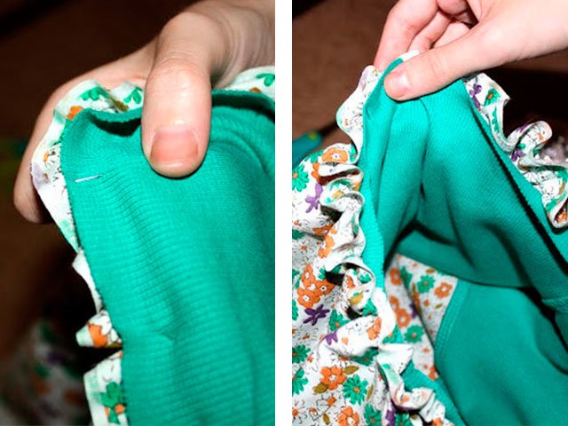 4. Connectez le haut et le bas, comme indiqué sur la photo ci-dessous, et notez les détails les uns aux autres. Le sommet devrait être sans plis, et la partie inférieure, au contraire. Si tout est fait correctement, alors n'hésitez pas à coudre à la machine à écrire.