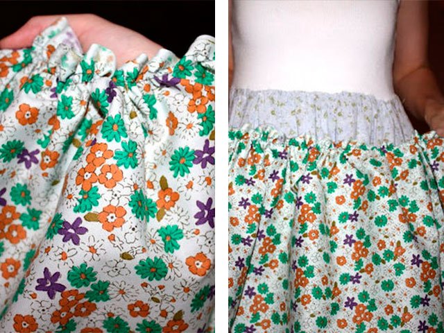 5. Si tu veux pas une jupe droite, mais plissée, puis coupez le motif en deux parties. Cousez le bas de l'assemblage. Peut ajouter jupon couleur différente. Et attachez tous les bords avec un ruban de la couleur d'un jupon.