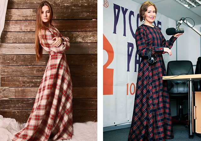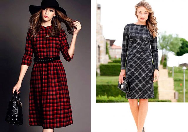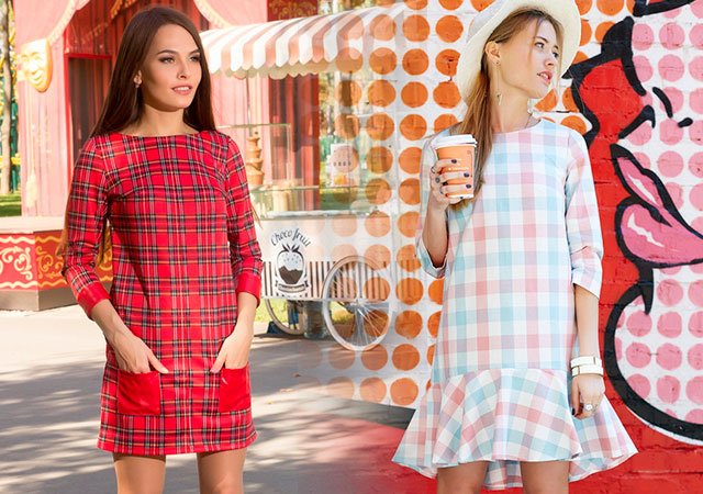 Aujourd'hui, sur le marché du commerce, vous trouverez une robe à carreaux sur le sol, courte, avec une manche, des poignets, un col et une robe fourreau, droite et évasée, avec des empiècements en cuir. 2024 robes à carreaux de différentes coupes.