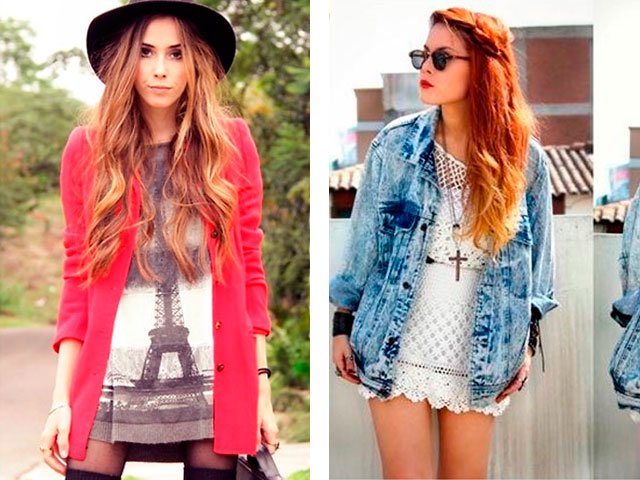 Avec une tunique et un chapeau de la couleur des chaussures, vous aurez l'air très élégant et féminin. Si vous n’avez pas peur de faire des expériences avec le denim, alors cette image vous convient: une robe courte en maille, beaucoup de chaînes sur la poitrine, des lunettes et de gros bracelets.