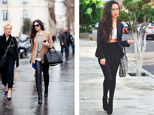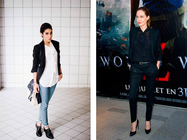 4. Veux-tu avoir le style d'une Angelina Jolly? Prenez des talons aiguilles noirs, un pantalon slim avec une ceinture en vernis, une blouse translucide et faites une queue courte!