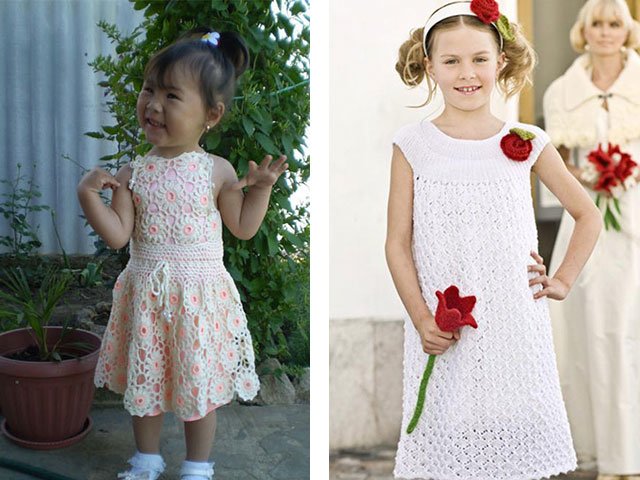 La robe tricotée au crochet pour une fille peut également avoir de nombreuses formes et motifs, qui sont parfaitement illustrés par les photos des enfants. Voici les robes chaudes pour enfants pour l'hiver, les robes d'été pour enfants et les tuniques provocantes pour enfants, etc. Mais les robes pour enfants en dentelle avec un beau motif floral se distinguent par un charme particulier.