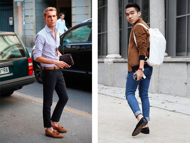Chaussures léopard en daim très populaires ou teintes vives et saturées. Par exemple, les mocassins de ton vin se marient parfaitement avec un pantalon slim ou un jean skinny foncé.
