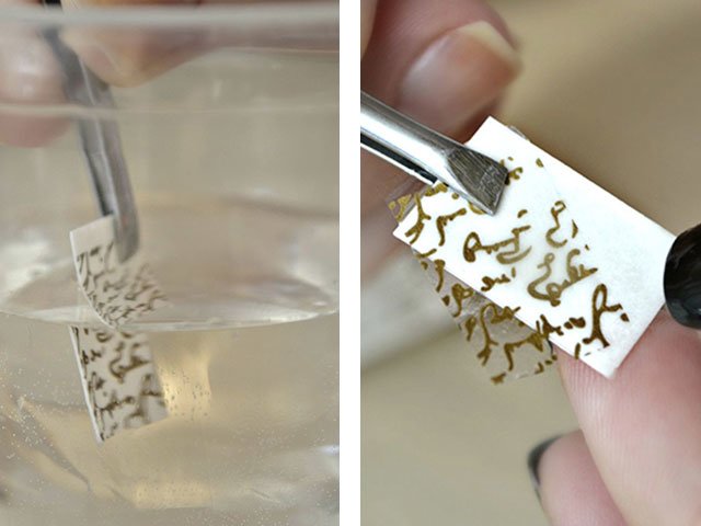 Le curseur ressemble à un petit morceau de papier épais qui doit être humidifié avec de l’eau et fixé à l’ongle, après fixation avec un vernis en gel transparent ou en haut. Une composition spéciale pour la fixation des motifs n'est pas nécessaire.