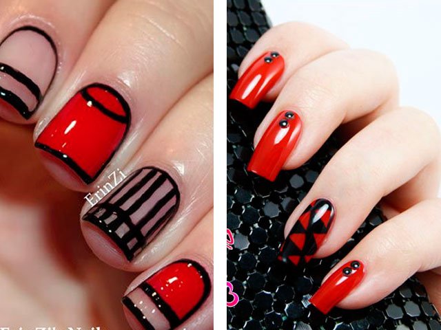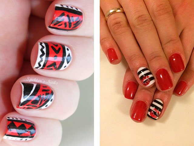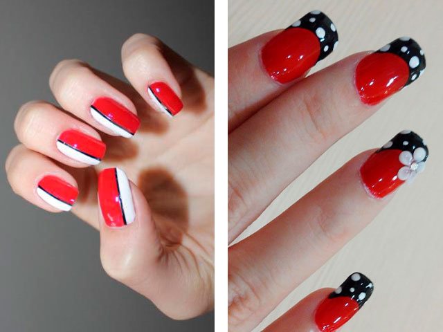 Manucure rouge avec du blanc et du noir.