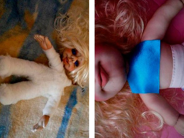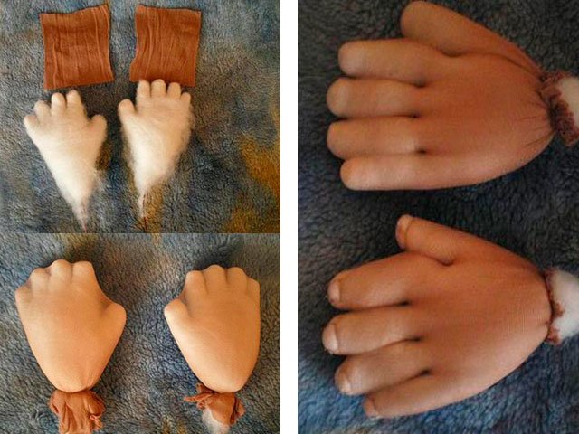 Les mains sont vissées au cadre squelette, la tête également. Ensuite, le corps est formé en enveloppant le fil avec un winterizer synthétique. Le reste du corps est tiré par Kapron, les aisselles sont formées à l'aide de fils et d'aiguilles et les articulations des paumes des mains et des mains sont masquées.