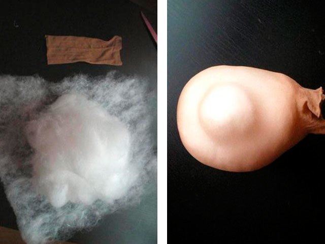 Pour elle, vous aurez besoin d’un morceau découpé de collants couleur chair, d’un morceau d’hiverizer synthétique de leur vieille veste ou de leur ancien oreiller (bien que vous puissiez en acheter un nouveau dans le magasin - c’est très bon marché) et de deux aiguilles sacrément avec des fils couleur chair.