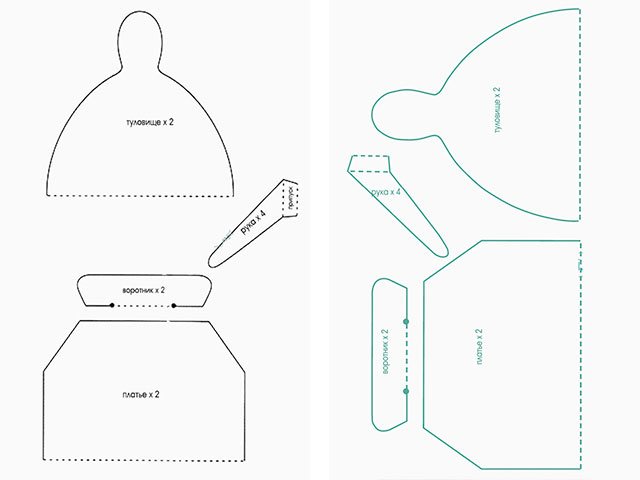 - Pour une robe, prenez deux morceaux de tissu de forme rectangulaire et pliez-les ensemble (à l'envers). Transférez le motif de la robe sur le tissu, cousez sur les côtés. Ensuite, vous devez repasser le surplus en haut des vêtements et les petits coins sur les côtés. Fermez la robe, passez-la aussi avec un fer à repasser et mettez-la sur la poupée. Cousez-le d'abord avec des coutures droites (le long des bords de l'ourlet et du cou) en serrant bien le fil. Aussi avec un collier. Puis cousez-le complètement.