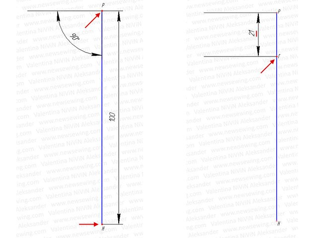 De pointDans à gauche le long de la ligne P2P1remettre à plus tard 2 voir et mettre un pointB2. De point B1 par le pointB2 tracer une ligne de longueur 8 cm et mettre un pointB3. Points B3P1 connecter avec une ligne droite et obtenir la ligne de dos.