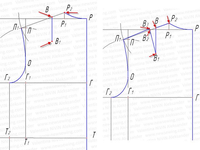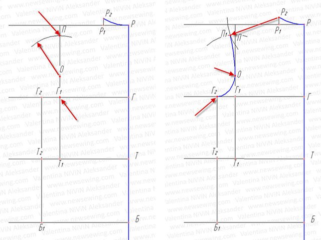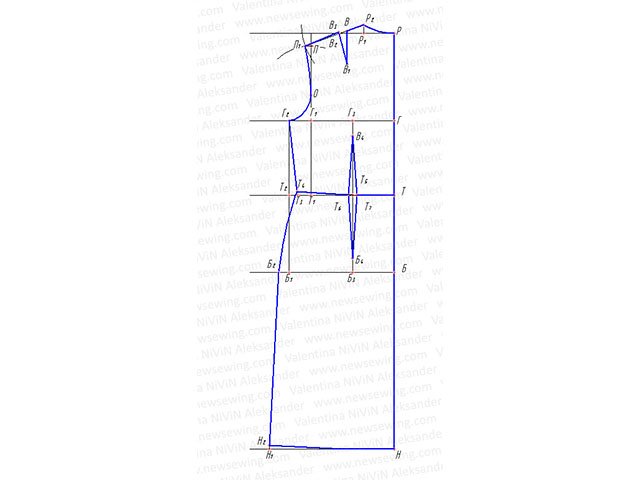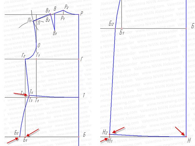 De pointN à gauche, nous reportons une valeur égale à la largeur du dos le long des hanches (voir dessin, cette distance) BB2) plus 2-3 cm et mettre un pointH1. Points H1 et B2 connectez une ligne droite. De point H1 mettre de côté 1cm et mettre un pointH2. Points H2 et Nconnectez une courbe lisse.