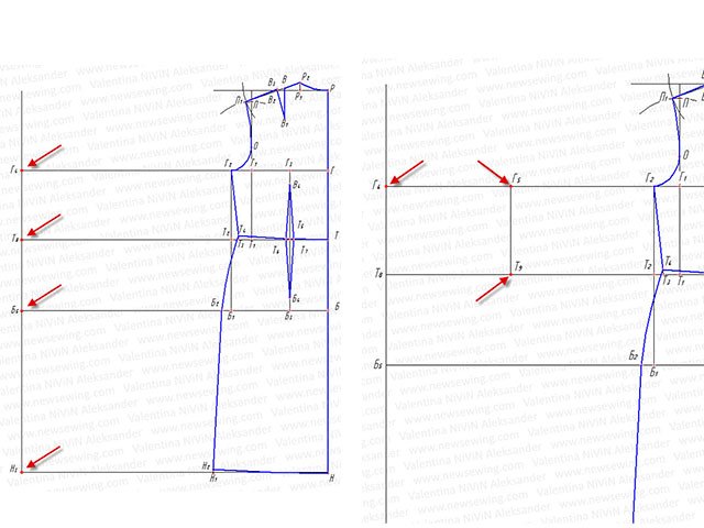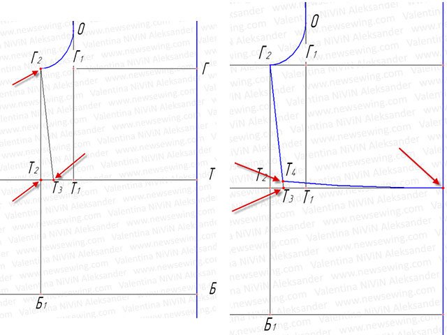 Distance GG1 diviser en deux et mettre un pointG3. De point G3 tracer une ligne verticale vers le bas et à son intersection avec la ligne de taille, nous mettons un pointT5, avec une ligne de hanches - un pointB3. De pointG3 pose le 4 cm et mettre un pointB4 mais du point B3 en haut - 3 cm et mettre un pointB4.