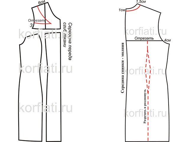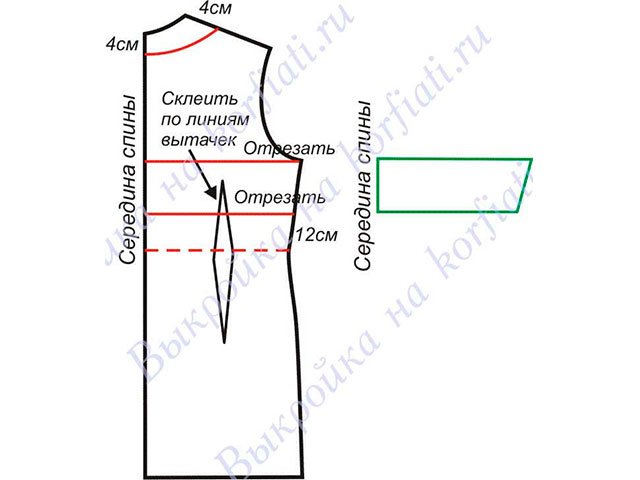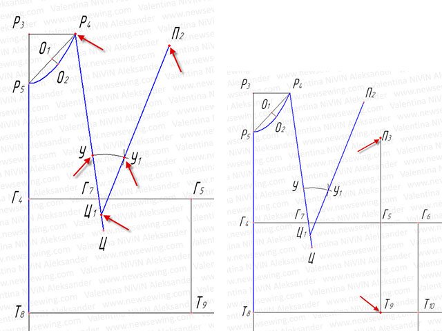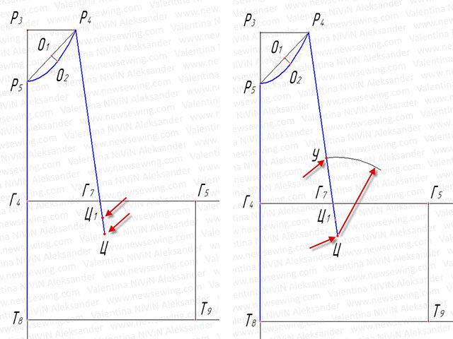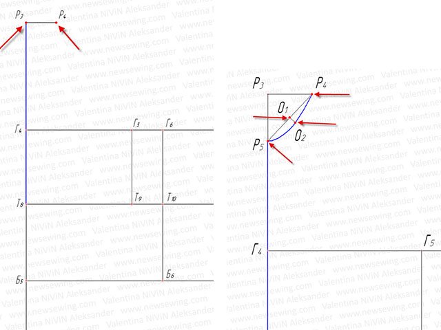 PointsP4 et P5 on connecte la ligne, on la divise en deux et le milieu indique le pointO1. De pointO1 mettre de côté à angle droit 1,25 cm et dénote le point02. Points P5, 02 et P4nous relions une courbe lisse et obtenons le décolleté de la tablette.