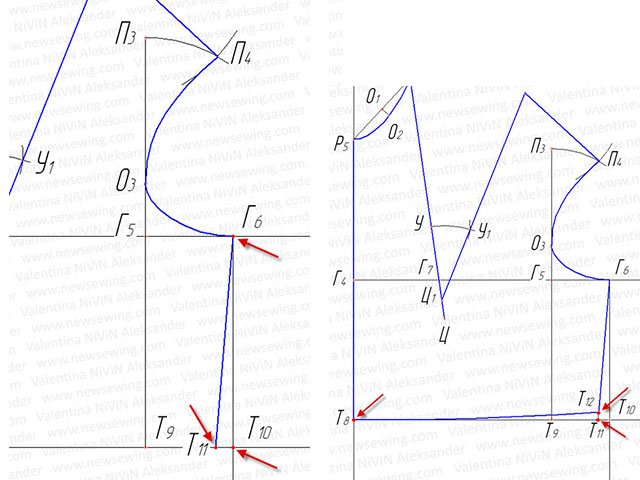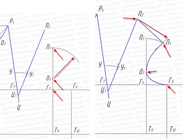 De pointG5 mettre de côté 1/4 les distances G5P3 (4,5 cm) et mettre un point03. Point 03 —point de contrôle. Lorsque vous insérez une manche dans une emmanchure, elle se connecte avec une marque sur la manche aux pointsOh