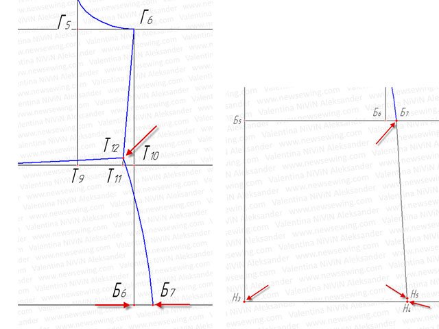De pointH3 à droite, nous reportons une valeur égale à la largeur du devant des hanches (voir dessin, cette distance) B5B7), plus 2-3 cm et mettre un pointH4. Points B7 et N4connectez une ligne droite. De pointH4 mettre de côté 1 cm et mettre un pointH5.