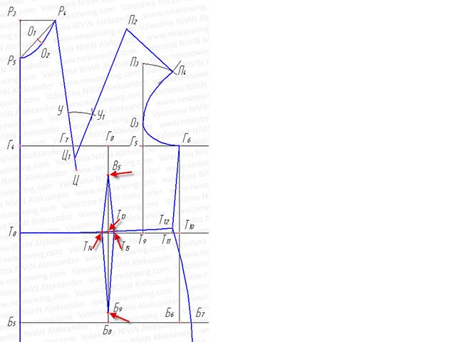 DistanceG7G5 diviser en deux et mettre t.G8. De point G8 tracez une ligne verticale vers le bas et mettez des points à l'intersection avec la taille et les hanchesT13 et B8. De pointG8 pose le 6 cmet du pointB8 up - 2 cm et mettre les pointsB5 et B9.