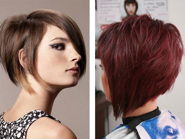 Une coupe de cheveux bob avec des mèches allongées à l’avant et une chevelure courte à l’arrière est idéale pour les femmes actives. Cela diffère de la variation classique des cheveux nettement raccourcis à l'arrière: ils peuvent couper l'arrière de la tête sous le garçon, peut-être avec une jambe, avec une belle échelle, etc. Sur la photo, vous pouvez voir une présentation différente d'une telle coupe de cheveux.