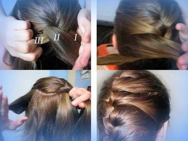 3) déterminez le point de départ de l'épillet et prenez un petit mèche de cheveux, puis un autre mèche de la moitié gauche et le troisième de la moitié droite des cheveux.