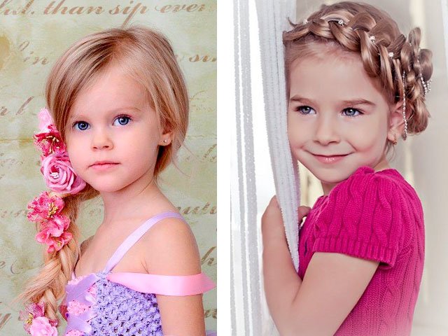 Vous pouvez toujours tresser de longues tresses ou de petites tresses aux épaules avec votre propre force dans un jardin d'enfants, qui sont déjà une décoration complète d'une petite tête. Avec l'ajout d'une variété de bijoux, votre fille sera une vraie princesse. Si vous ne savez pas comment tisser de longues boucles, optez pour un faisceau bas et un pieu dans le dos, orné d'un cerceau orné de fleurs sur la tête ou d'un élégant noeud. Pour ce faire, commencez avec un tas sur le dessus, puis collectez les cheveux dans une queue basse et enveloppez-les dans un chignon, tout en les renforçant avec des épingles à cheveux. Soigneusement mis sur une belle lunette et fixer avec du vernis. Une autre façon de former un nœud haut, pour lequel vous avez besoin de la capacité de tisser une tresse française inversée. Tissez de la base du cou au milieu de la tête, ramassez les boucles restantes dans une queue et faites-la tourner autour de son axe. Sur le côté, vous pouvez décorer avec un nœud, une belle bande élastique autour du nœud ou une écharpe brillante.