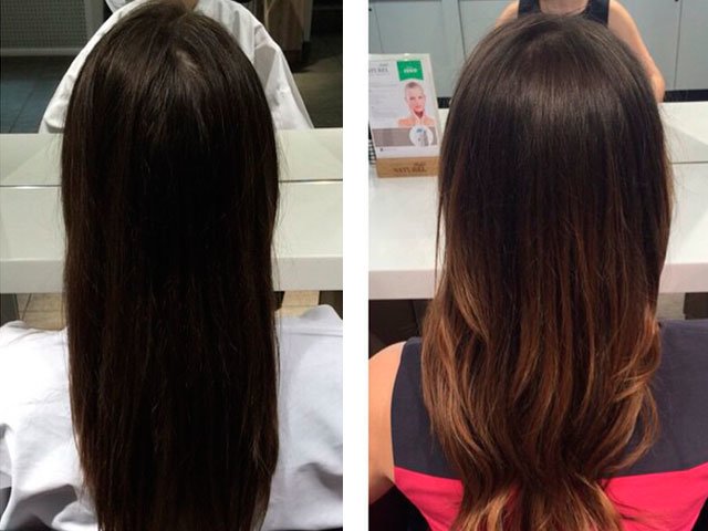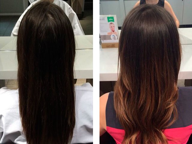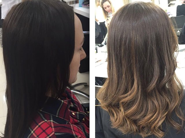 Soulignement vénitien sur les cheveux noirs avant et après les photos: