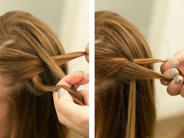 2. Sélectionnez les trois premiers brins (le repère du temple) - vous voulez que la tresse soit élégante et fine, prenez une fine boucle, vous voulez une volumineuse, ce qui signifie que les brins sont également plus épais. La première usine de brin est réalisée dans la version classique, à l'exception d'un point - la partie qui est enroulée du haut de la tête est libérée (le premier jet de la cascade) et une nouvelle est prise à sa place du haut de la chevelure.