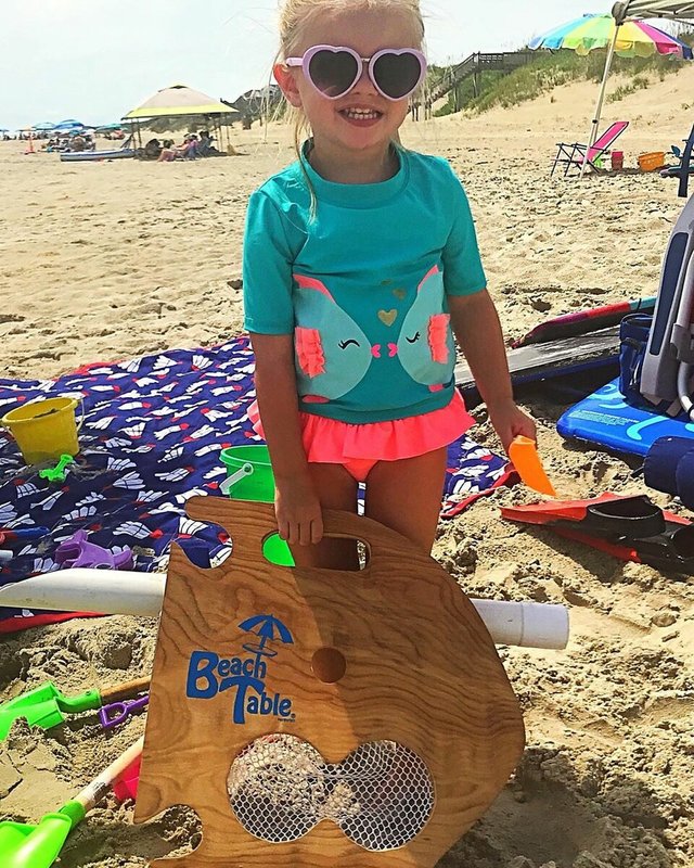 Tout irait bien, mais un verre d'eau ou une tasse portable tombe toujours. Et les verres avec des crèmes sont toujours dans le sable. Par conséquent, une invention telle qu'une table de plage plaît. À propos, il peut également servir de support pour un ordinateur portable.