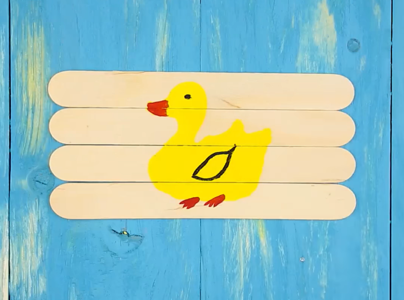 Pliez les bâtons utilisés de manière à obtenir un rectangle ou un carré. Dessinez maintenant un motif sur eux. Pour les enfants, quelque chose de familier et de grandes tailles convient, par exemple: canard, ours en peluche, chat, etc.