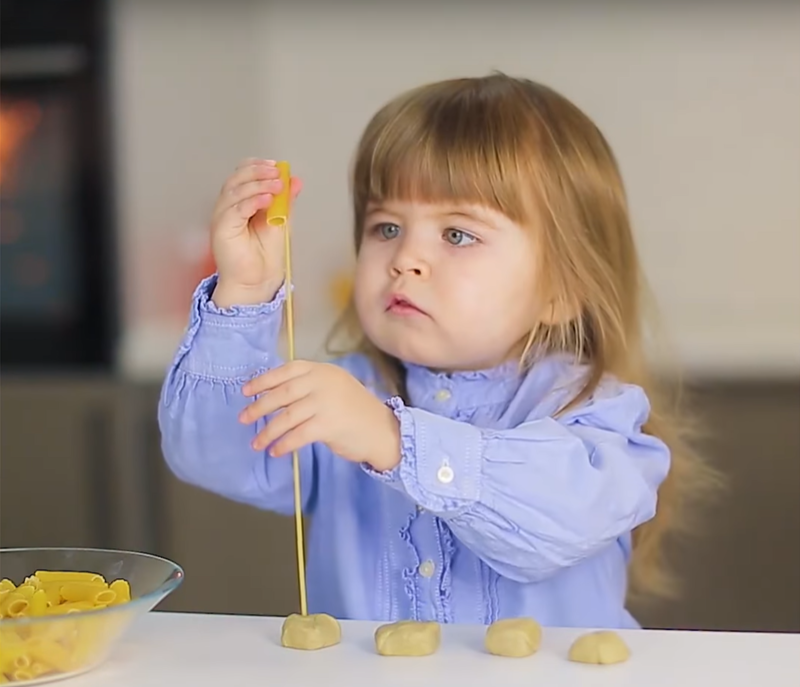Maintenant, le bébé peut ficeler des pâtes de différentes formes sur des spaghettis et construire ses propres tours de formes étranges.