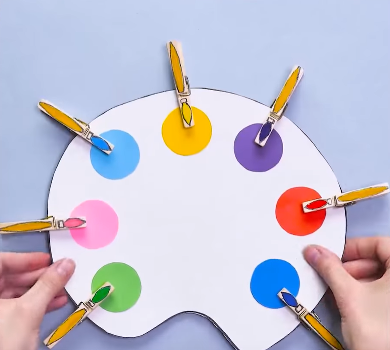 Un autre jeu de correspondance des couleurs. Pour ce faire, vous devez découper une figure dans un papier qui ressemble à une palette de couleurs. Dessinez dessus les "endroits" appropriés pour la peinture et la peinture.