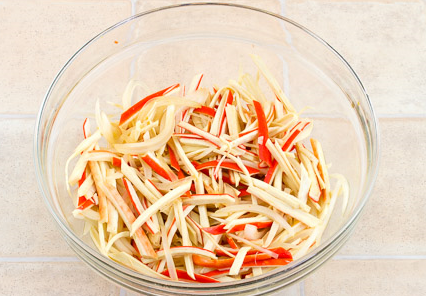 Étape 4 Mettez les bâtonnets de crabe et les oignons dans un saladier. Verser la marinade, mélanger, laisser mariner pendant 15-30 minutes.