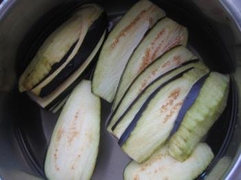 Étape 2 Versez de l'eau dans un bol profond, salez bien et baissez les aubergines pendant 10-15 minutes. Ceci est fait afin de supprimer l'amertume.