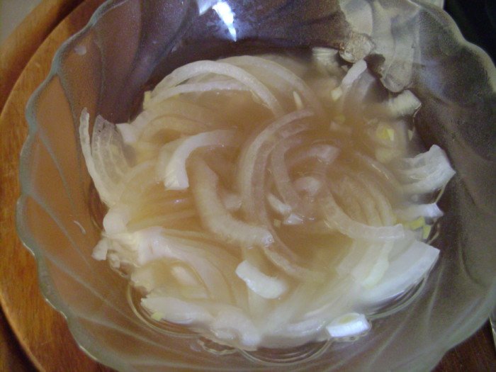 Étape 2 Couper l'oignon en demi-anneaux et verser 2 cuillères à soupe. à soupe de vinaigre de cidre.