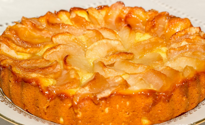 Étape 8 Mettez les pommes sur la pâte. Lubrifiez-les avec un vernis. Cuire le gâteau au four pendant 45 minutes à 180 degrés.