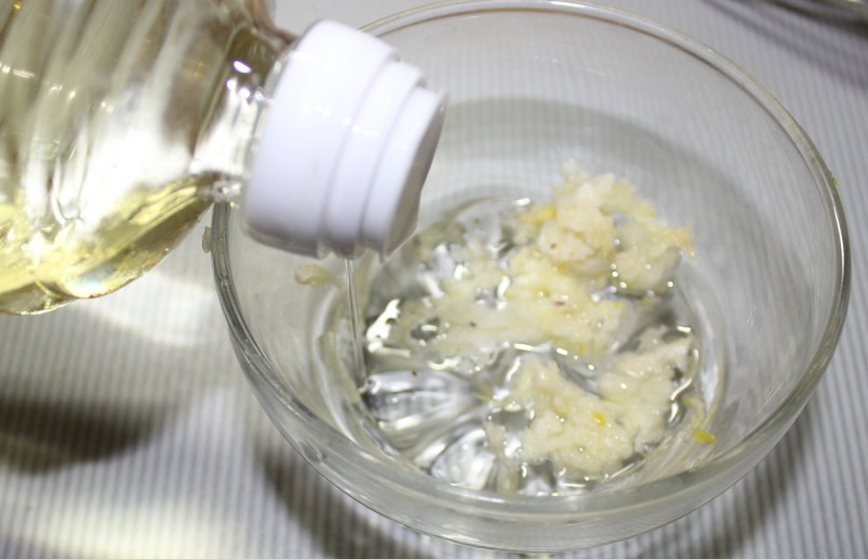 Étape 3 Broyer l'ail avec un presse-agrumes. Ajouter de l'huile végétale, mélanger.