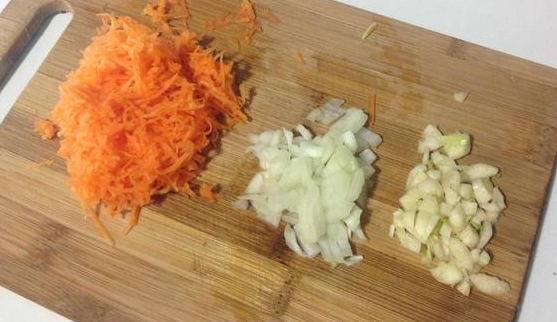 Étape 3 Pendant que la viande est cuite éplucher les carottes, les oignons, l'ail. Hacher finement l'oignon et l'ail, et râper les carottes sur une râpe grossière.