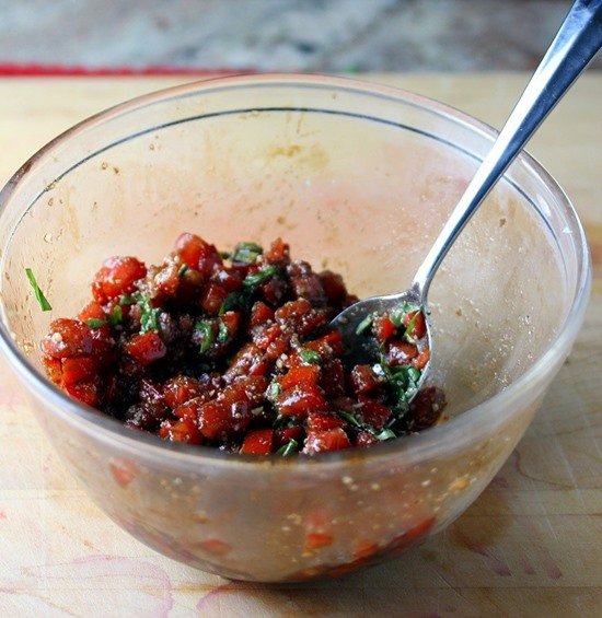 Étape 3 Faites blanchir les tomates, puis hachez-les finement. Les poivrons sont pelés et coupés en dés. Versez les légumes avec de l'huile d'olive (1 cuillère à soupe) et de la sauce soja (1 cuillère à soupe).