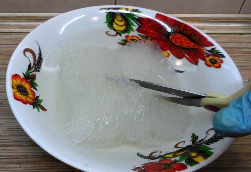 Étape 2 Chaque morceau de funchose sec est un fil de plusieurs mètres enroulé en boule. Pour la commodité de manger, il est souhaitable de le raccourcir: coupez chaque enchevêtrement dans l’eau avec des ciseaux de cuisine à 3-4 endroits.