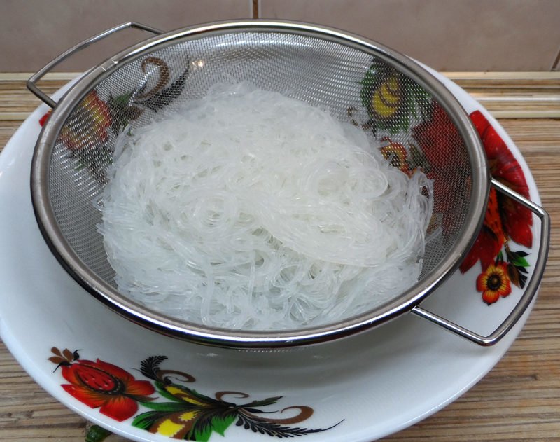 Étape 1 Mettez quelques enchevêtrements de funchose dans une assiette creuse. Ensuite, versez les nouilles avec de l'eau bouillante et laissez tremper pendant 3-5 minutes.