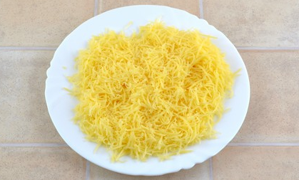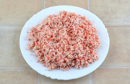 Étape 2 Râper les bâtonnets de crabe sur une râpe fine (un bâtonnet peut être laissé pour la décoration). Il est préférable de frotter les bâtons congelés.