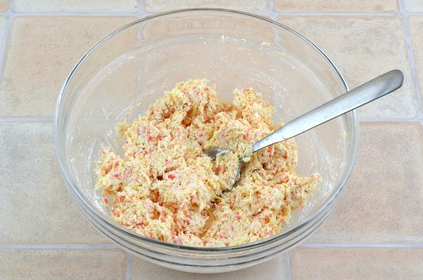 Étape 4 Mettez le fromage, les œufs et les demi-bâtonnets de crabe dans un saladier.
