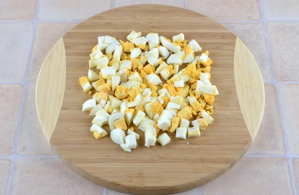 Étape 2 Faire bouillir les œufs dans une pente raide, peler et couper en petits carrés.
