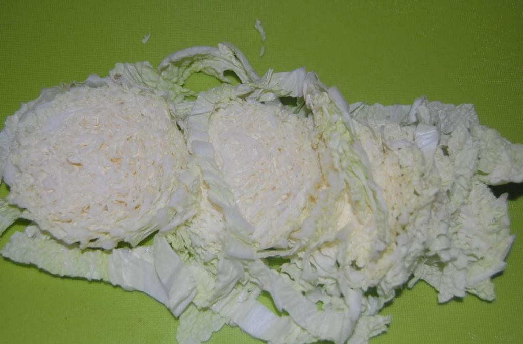 Étape 3 Rincer le chou de Beijing sous l'eau courante. Ensuite, hachez les feuilles en fines lanières.