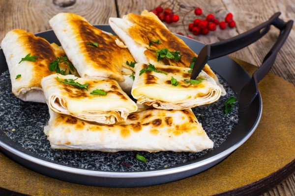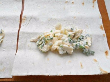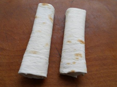 Étape 4 Rouler lavash avec un tube, pliant dans les bords. Laissez le pain pita roulé pendant 3 à 4 minutes pour faire tremper un peu de farce.