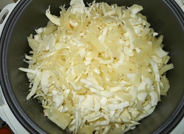 Étape 3 Versez l'huile végétale dans le bol multicuiseur, mettez les oignons, les carottes et faites frire dans le mode "Frying", faites frire pendant environ 10 minutes. Vous pouvez ignorer cette étape si vous le souhaitez.