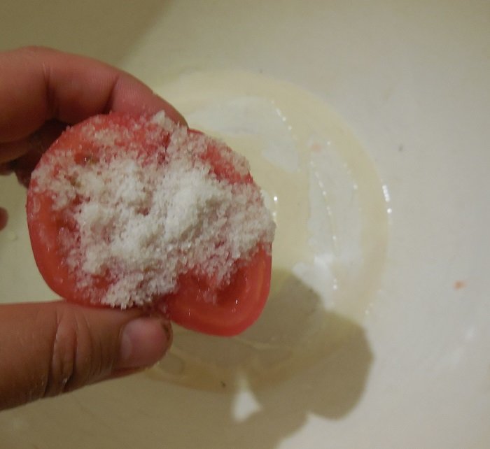 Étape 10 Trempez ensuite chaque moitié de la tomate avec une tranche de sel et déposez-la dans un récipient avec du miel.