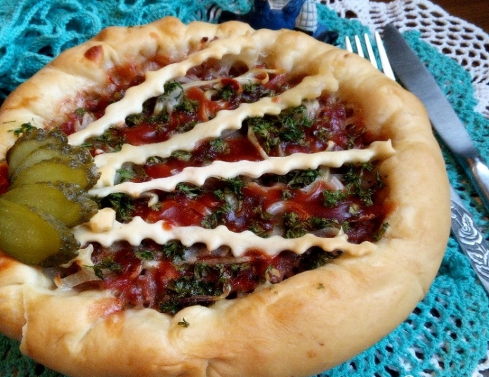 Étape 6 Déplacez la plaque de cuisson avec la préparation de la tarte à la levure avec la viande dans un four chauffé au rouge, où elle est cuite à 190 degrés 45 minutes. Au service, ajoutez une tourte à la viande avec des cornichons et dégustez un goût incroyable.