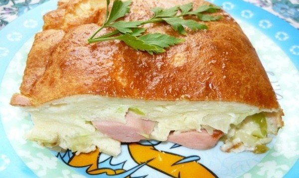 Étape 8 Laisser refroidir un peu la tarte avec le chou et les saucisses et servir, couper en portions.