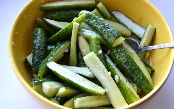 Étape 1 Lavez les concombres, coupez les queues. Couper dans le sens de la longueur en 4 parties, comme indiqué sur la photo.